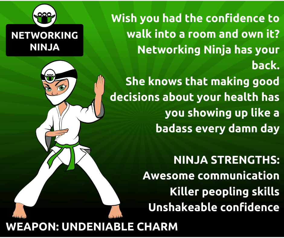 Networking Ninja, the most sociable of the team, is all about healthy relationships….with food, family, friends, and in your business.
